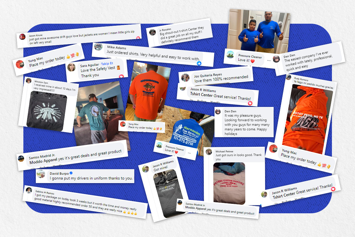 These are actual customers who use the services provided by T-Shirt Center to create custom-designed t-shirts for their business or personal use.